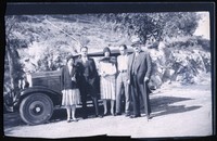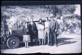 Grupo de mujeres y hombres, aparecen retratados al exterior de un automóvil de la época a los pie de un cerro.