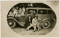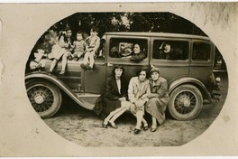 Grupo de mujeres al interior y exterior de un automóvil de la época y niños sentados en al capó del vehículo.