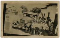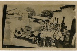 Grupo de niños descalzos, aparecen en la fotografía junto a un automóvil, en el que se observa a dos hombres en su interior y que está estacionado fuera de algunas casa de adobe, y en una de las cuales aparece un sombrero sobre una maleta en la entrada.