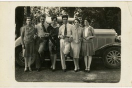 Grupo de mujeres y hombres jovenes, aparecen retratados con las manos tomadas afuera de un automóvil de la época en un lugar de frondosa vegetación.