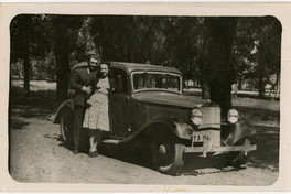 Pareja de mujer y hombre, aparecen retratados fuera de un automóvil patente YA-156, Conchalí, en un parque que podría ser el Forestal.