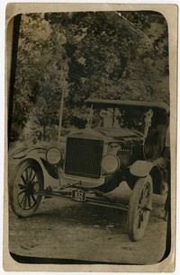 [Automóvil detenido en un parque y hombre en la pisadera] [fotografía]. Santiago : [entre 1910 y1920]. 1 fotografía : monocromo, gelatina sobre papel fibra ; 13 x 9 cm. .