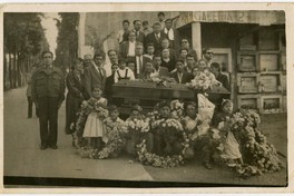 [Personas en Cementerio con coronas de flores junto a féretro] [fotografía].