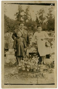 [Familia alrededor de una tumba en cementerio] [fotografía]. [Chile : entre 1940 y 1960]. 1 fotografía : monocromo, gelatina sobre papel fibra ; 14 x 9 cm. .