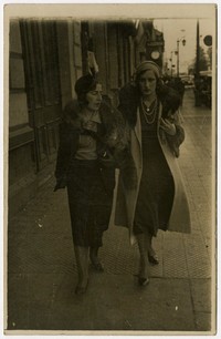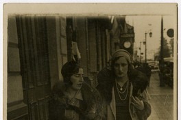 [Dos mujeres con sombrero caminando por una calle céntrica] [fotografía]. [Santiago? : 192-?]. 1 fotografía : monocromo, gelatina sobre papel fibra ; 14 x 9 cm. .