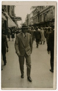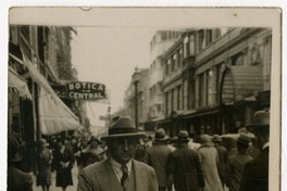 [Hombre con sombrero caminando por calle Estado] [fotografía]. [Santiago : entre 1920 y 1930]. 1 fotografía : monocromo, gelatina sobre papel fibra ; 14 x 9 cm .