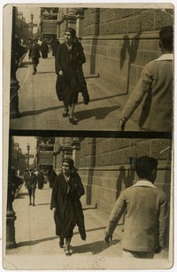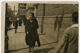 [Mujer caminando por calle céntrica] [fotografía]. [Santiago?] : 1931. 1 fotografía : monocromo, gelatina sobre papel fibra ; 14 x 9 cm. .