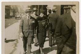 [Mujer y hombre caminando por una calle céntrica de la capital] [fotografía]. [Santiago : entre 1920 y 1930]. 1 fotografía : monocromo, gelatina sobre papel fibra ; 14 x 9 cm. .