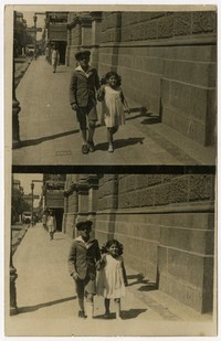 [Dos hermanos] caminan de la mano por el centro; las dos secuencias nos muestran al niño con boina y pantalones cortos y a la niñita con vestido.