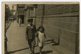 [Niños caminando por calle céntrica de la capital] [fotografía]. [Santiago : entre 1920 y 1930]. 1 fotografía : monocromo, gelatina sobre papel fibra ; 14 x 9 cm. .