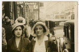 [Dos mujeres con sombrero caminando por calle céntrica] [fotografía]. Santiago : [Editor no identificado] , 1932. 1 fotografía : monocromo, gelatina sobre papel fibra ; 14 x 9 cm. .