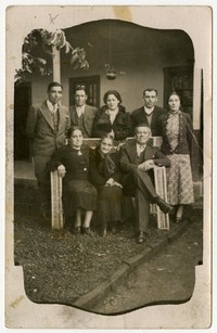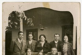 Grupo familiar compuesto por adultos, aparecen retratados en un jardín fuera de una casa de estilo colonial. En el centro de la fotografía, y en un sillón de mimbre, una mujer anciana aparece rodeada de mujeres y hombres que miran en dirección a la cámara.