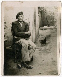 Hombre con boina y brazos cruzados sentado en una silla de mimbre afuera de una casa, ubicada en una calle de tierra; un pooc más allá, hay una gallina.
