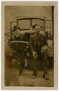 [Bandoneonista y hombre apoyados en un automóvil] [fotografía]. [Chile : entre 1920 y 1939]. 1 fotografía : monocromo, gelatina sobre papel fibra ; 14 x 9 cm. .