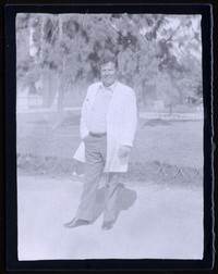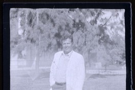 [Médico en los jardines de un hospital] [fotografía]. [Chile : entre 1930 y 1950]. 1 fotografía : negativo sobre papel ; 9 x 7 cm. .