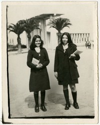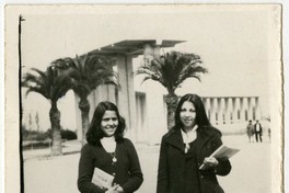 Dos muchachas estudiantes con uniforme y cuadernos en el Templo Votivo de Maipú.