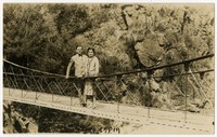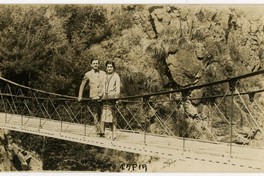 [Mujer y hombre sobre puente colgante en Termas de Cauquenes] [fotografía]. Cauquenes : [entre 1920 y 1939]. 1 fotografía : monocromo, gelatina sobre papel fibra ; 9 x 14 cm. .