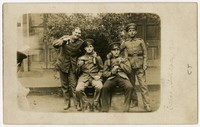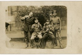 Cuatro uniformados son retratados fuera de una casa y delante de un arbusto, mientras sostienen vasos y botellas de licor, exhibidas por dos de ellos y que aparecen en la fotografía de pie, junto a los otros dos uniformados que aparecen sentados. En el costado izquierdo de la fotografía, se observa parte de la gorra de otro uniformado.