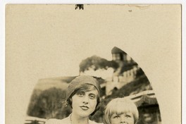 Mujer con boina y joyas, aparece en la fotografía sosteniendo a niña pequeña que tiene arena en las piernas, y con quien pareciera estar sobre roquerío de un balneario. De fondo, se observa las construcciones de esa localidad no identificada y una colina.