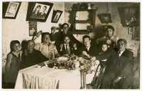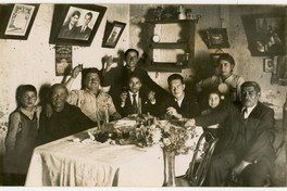 Grupo familiar compuesto por adultos y dos niños, aparecen en la fotografía alrededor de una mesa en la se observa dos jarrones de cristal con vino. Los comensales levantan las copas mientras miran sonrientes a la cámara. Alrededor, diversos adornos y cuadros adornan las paredes del comedor. Entre los objetos, un calendario donde se lee "Compañía de seguros Sol de Chile La Patria", Oficina Bandera 58, con la hoja del mes de abril del año 1942, y un retrato fotográfico de una mujer y un hombre en el centro del muro.