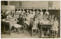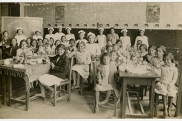 [Niñas en comedor de escuela básica celebran la semana del niño] [fotografía]. [Chile : entre 1930 y 1940]. 1 fotografía : monocromo, gelatina sobre papel fibra ; 9 x 14 cm .