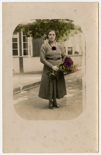 [Mujer con ramo de flores] [fotografía]. [Chile : entre 1940 y 1950]. 1 fotografía : monocromo, gelatina sobre papel fibra ; 14 x 9 cm. .