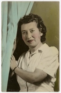 Mujer adulta con blusa y reloj, aparece retratada descorriendo una cortina, que así como su rostro, ha sido coloreada.