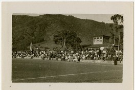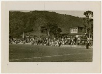 Multitud aparece en la fotografía sobre una gradería observando un espectáculo, presumiblemente deportivo, llevado a cabo en una cancha. Atrás, una casa de dos pisos, y de fondo, una colina con vegetación.