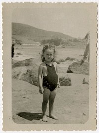Niña pequeña aparece en la fotografía, con traje de baño oscuro de lana en el que se lee las iniciales "H F R". De fondo, rocas, el mar y una colina a lo lejos.