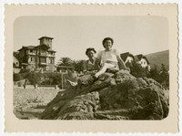 [Mujeres sobre roca en balneario de Papudo] [fotografía]. Papudo : [entre 1940 y 1950]. 1 fotografía : monocromo, gelatina sobre papel fibra ; 6 x 9 cm .