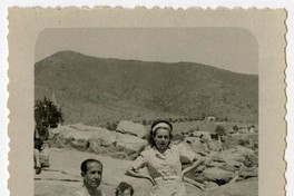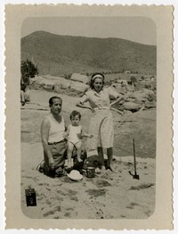Mujer con cintillo, aparece en la fotografía en un balneario junto a hombre que fuma y que en sus pìernas sostiene a una niña pequeña. En la arena se observa una pala, el sombrero de la niña, un balde y una cámara fotográfica. Atrás, roquerío y de fondo, una colina.