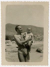[Hombre con niño en los brazos] [fotografía]. [Chile : entre 1940 y 1950]. 1 fotografía : monocromo, gelatina sobre papel fibra ; 9 x 6 cm .
