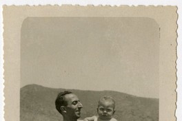 Hombre con traje de baño, con un niño en los brazos en balneario no identificado;de fondo, otros veraneantes y una colina.