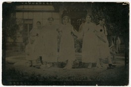 Grupo de mujeres jovenes, aparecen retratadas de pie al borde de fuente de agua en un jardín. De fondo, una casa con enredaderas en la entrada.