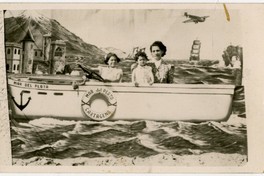 Mujer adulta, aparece en la fotografía junto a dos niñas detrás de un bote pintado en el que se lee "Mar del Plata" a un costado y "Mar del Plata-Cartagena" escrito en el salvavidas de ese bote, en el que además aparece un ancla, y que forma parte de un paisaje en el que se observa un barco a vela, un velero, un avión, un volcán y una construcción con torreón.