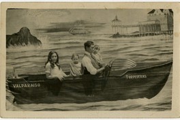 Familia compuesta por una mujer, un hombre y dos niños pequeños, aparecen retratados detrás de un bote en el que se lee "Valparaíso-Torpederas", y que forma parte de un paisaje pintado en telón de fondo, en el que además se observa de fondo, un montículo rocoso, una embarcación a vela, un muelle y una construcción.