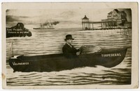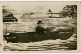 Hombre con sombrero, aparece en la fotografía detrás de bote donde se lee "Valparaíso-Torpederas" y que está pintado en telón de fondo, donde además se observa un muelle, un buque en el horizonte, un montículo rocoso en medio del mar donde aparece escrito "Fume Piccardo Habanos de alta calidad" y detrás del muelle, una construcción de varios pisos donde se lee "Fume Julepe ovalados gruesos 40 ctvs".