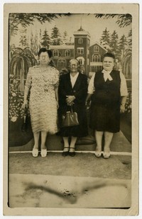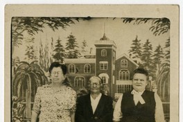 Tres mujeres adultas, aparecen en la fotografía delante de una casa y un jardín, pintados en telón de fondo.