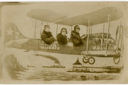 Tres mujeres con sombrero, aparecen en la fotografía detrás de una avioneta pintada en telón de fondo, en la que se lee "[Recuerdo] Fiesta de la raza". Pintura en la que además se observa un montículo rocoso, un muelle y otras embarcaciones.