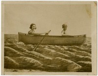 [Mujer y niño detrás de bote de telón de fondo] [fotografía].
