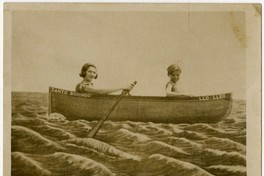 Mujer aparece retratada sosteniendo un remo que descansa en oleaje pintado en telón de fondo, así como el bote en el que ella y un niño se encuentran, y en el que se lee "Santo Domingo-Llo Lleo".