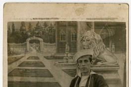 Joven marino aparece en la fotografía sentado en una banca delante de telón de fondo en el que se observa la pintura de un jardín de tipo real, en el que aparece la escultura de un león, una fuente de agua, una construcción y de fondo, la entrada a ese lugar. En la gorra del retratado se lee "[...] de Artillería".