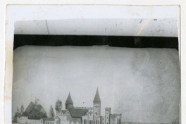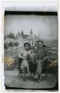 Mujer y hombre, aparecen en la fotografía sentados en una banca junto a niño pequeño, delante de telón de fondo en el que se observa la pintura de un paisaje urbano, en el que aparece un castillo de piedra, el mar, una embarcación, y un automóvil en una avenida antes de llegar a una curva.