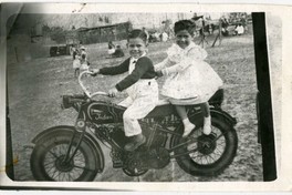 Niña y niño aparecen en la fotografía sobre motocicleta pintada como telón y en la que se lee "Indian", escrito bajo la bandera de Chile. De fondo, varias personas en lugar descampado, caballos, un camión y una construcción de madera.