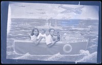 [Familia detrás de bote pintado en telón de fondo] [fotografía]. Papudo : [entre 1940 y 1950]. 1 fotografía : negativo ; 9 x 14 cm .