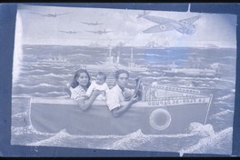 Mujer con blusa cuadrillé, aparece en la fotografía junto a hombre y niño pequeño detrás de bote pintado en telón de fondo y donde se lee, al revés, "La flor de Papudo". Además se observa un paisaje marino con diversas embarcaiones y aviones.