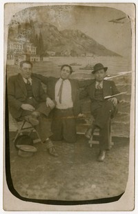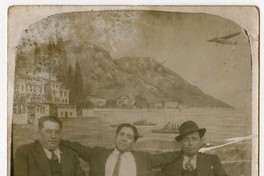 Un hombre arrodillado abraza a otros dos hombres sentados, con quienes aparecen en la fotografía retratados delante de telón de fondo, en el que se observa la pintura de un paisaje costero; con embarcaciones, un avión, y con algunas construcciones cercanas a una colina y rodeadas de árboles.