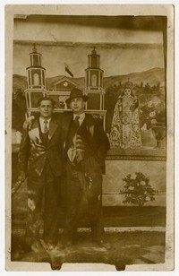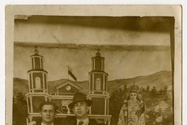 Dos hombres adultos, aparecen en la fotografía abrazados delante de telón de fondo, en el que se observa la pintura de la Iglesia de Andacollo junto a la imagen de la Vírgen del Carmen. En el escudo aparecido en el frontis de la Iglesia, se lee "año [...]".