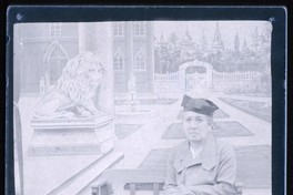 Mujer con sombrero y cartera, aparece en la fotografía sentada en una banca delante de un telón de fondo, en el que se observa la pintura de un jardín de tipo real, en el que se aprecia la escultura de un león, una construcción, y al fondo, la entrada a ese lugar.