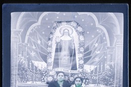 [Mujer y niña delante de telón de fondo con la imagen de Santa Rosa] [fotografía]. [Chile] : 1946. 1 fotografía : negativo sobre papel ; 9 x 7 cm .